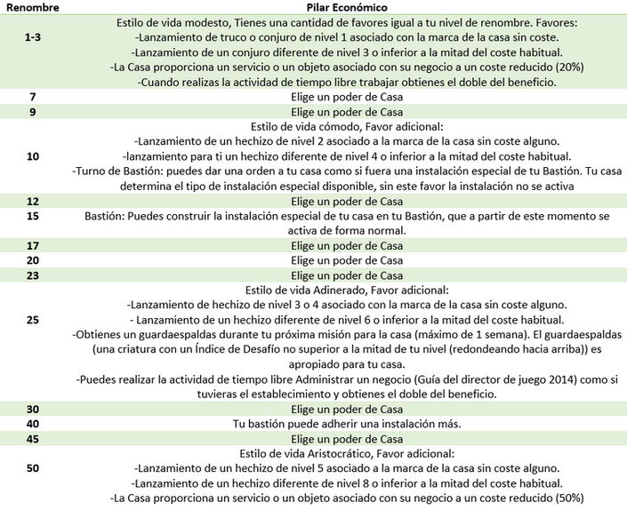 Cada uno de los pilares tiene una progresion de beneficios de renombre estandar que aplica para cualquier organizacion incluida dentro del pilar, estos beneficios se obtienen siempre que el personaje alcance cada nivel de renombre dentro de ese pilar, si el personaje obtiene renombre con mas organizaciones dentro del mismo pilar no repite los beneficios ya obtenidos y solo obtiene los poderes de organizacion segun vaya alcanzando los niveles adecuados.