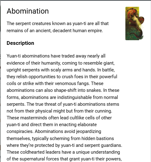 Serpientes monstruosas con corpulentos torsos y brazos humanoides, las abominaciones conforman la casta más alta de la sociedad yuan-ti, y son las que más se asemejan a la raza tal como la concibieron los dioses serpiente. Plantean intrincados planes y realizan oscuros ritos con la esperanza de algún día gobernar el mundo.